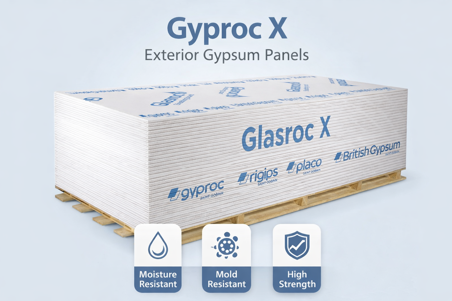 Glasroc X Board is a gypsum board with mat reinforcement which has inherent mould resistant properties. The glass fibre mat protects the board with its hydrophobic coating, and has additional UV resistant properties. Glasroc X Board is a high performance board with a gypsum core containing special additives for moisture and mould resistance. Glasroc X is reinforced board with a glass-mat on both surfaces and finished with a UV resistant coating, providing outstanding performance in humid environments. This non-paper faced board, free from cellulose content and therefore has a strong inherent resistance to mould growth, which is perfect for wet areas and high-humidity environments including exterior applications. Easy to Score and Snap Easy to Screw Fix Easy to Handle High labour Productivity Glass mats have a physical anchorage with the gypsum core, ensuring a strong bond that creates a monolithic board of high strength, solidity and exceptional integrity. Glasroc® X is an ideal substrate for Direct Render application (also known as Direct Apply Systems). It is designed especially for exterior applications and tested against real weather conditions. This high-performance board can be used for areas requiring high protection against water, and is the perfect solution for exterior ceilings, external wall systems and facade cladding systems. The board is available in the size 1200 x 2400 mm, (other lengths can be order depending on quantities required) with longitudinal tapered or squared edges. Board Colour Front Side - White face glass mat liner with Glasroc X branding Reverse Side - White Standards EN 15283-1:2018 Type GM-FH1 ASTM C1177 - 17 Type X, ASTM C1658 - 18 tYPE X Thermal Conductivity 0.19 (W/m°K) Gyproc Ceiling Solutions Gypsum Plastering Exterior walls Building Sciences Building Acoustics Fire Protection Indoor Air Quality Products PlasterBoards PlasterBoards Habito Standard Rigiroc Glasroc X Gypboard® Plain MR Board Fireline FRMR Duraline Habito Glasroc H Activ Air SoundBloc Core Board Fiber Cement Board Gypboard® Kool Gypboard® Dampline Board Metal Framing & Accessories Metal Framing & Accessories Overview Gypframe® Xpert GypFrame® MegastilTM GypSerra Framing System Gypliner Wall & Ceiling Lining System Metal Accesories Jointing and Finishing Concept of Jointing & Finishing FinishPro Pro - Fill Easi - Fill®90 Easi - Fill Hydro Easi - Fill Quick Set Gyproc Tapes Gyproc Levelline® Flex Corner Tape Gypsum Plasters Gyproc Plastering Levelling Bonding Glass Fiber Mesh Ceiling Tiles Ceiling Tiles and Solutions By material Type Gypsum Ceiling Tiles HomeProducts - PlasterBoardsGlasroc X Board Glasroc X Board is a gypsum board with mat reinforcement which has inherent mould resistant properties. The glass fibre mat protects the board with its hydrophobic coating, and has additional UV resistant properties. Glasroc X Board is a high performance board with a gypsum core containing special additives for moisture and mould resistance. Glasroc X is reinforced board with a glass-mat on both surfaces and finished with a UV resistant coating, providing outstanding performance in humid environments. This non-paper faced board, free from cellulose content and therefore has a strong inherent resistance to mould growth, which is perfect for wet areas and high-humidity environments including exterior applications. Easy to Score and Snap Easy to Screw Fix Easy to Handle High labour Productivity Glasroc X Board Brochure Glasroc X Board by Gyproc Thickness 12.5 mm Width 1200 mm 1220 mm Length 2400 mm 2440 mm Edge Type TE/SE TE/SE Board Colour Front Side - White face glass mat liner with Glasroc X branding